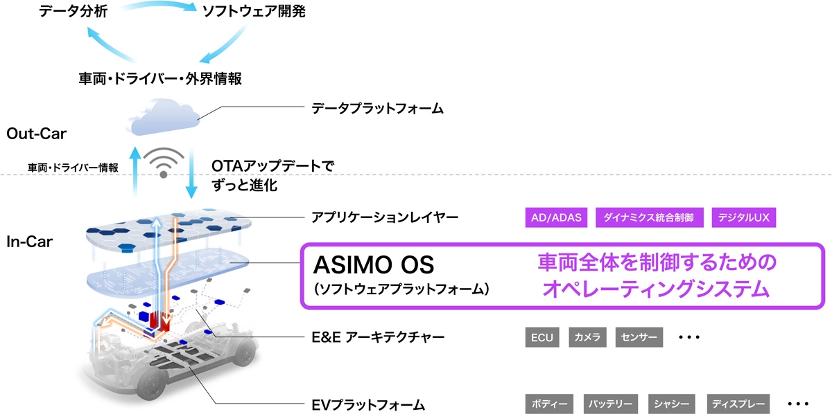 ASIMO OSはソフトウェアプラットフォームとして、AD(自動運転)/ADAS(先進運転支援)や車載インフォテイメントIVI、ダイナミクス統合制御といった車両の主要システムを統括するECU(電子制御ユニット)を一元管理する。スマートフォンのOSと同様、販売後もOTA経由でソフトウェアを継続的にアップデートする仕組みだ。