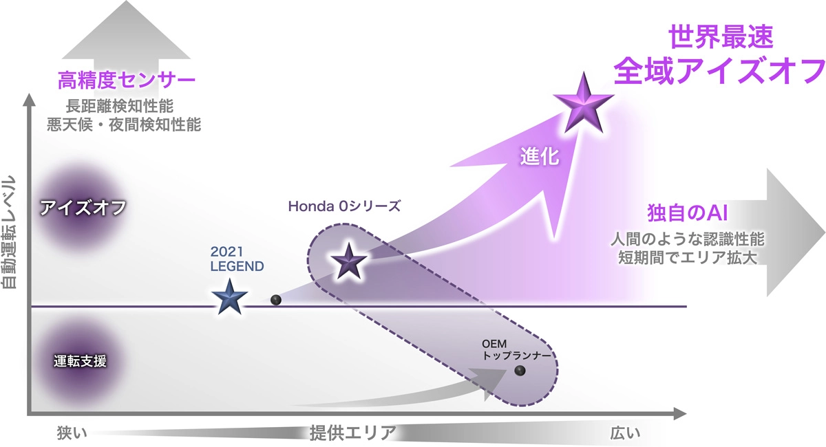 ホンダはレベル3の市販車化という観点で、世界で最も先行しているメーカーだ。2021年3月、高速道路での渋滞時アイズオフを可能にする「Honda SENSING Elite(ホンダ センシング エリート)」を搭載した「LEGEND(レジェンド)」を発売。これは世界初の自動運転レベル3実用化という歴史的な実績となった。その知見と技術の蓄積が、Honda 0 SALOONへと受け継がれていく。