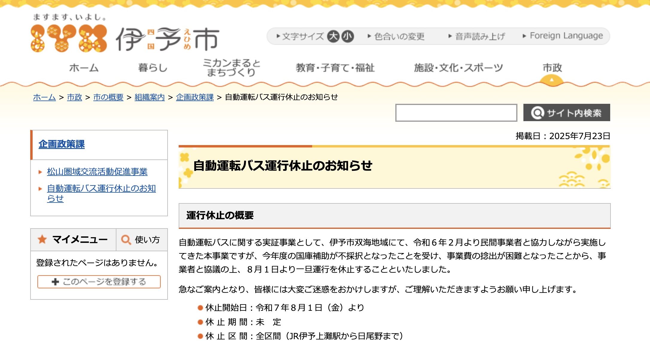 愛媛県伊予市は、2025年度の同事業で不採択となったことを受け、継続していたサービス実証を中止した。同市はBOLDLYと組み、2024年2月から市内双海地域でMiCaの実証運行を行っていた。