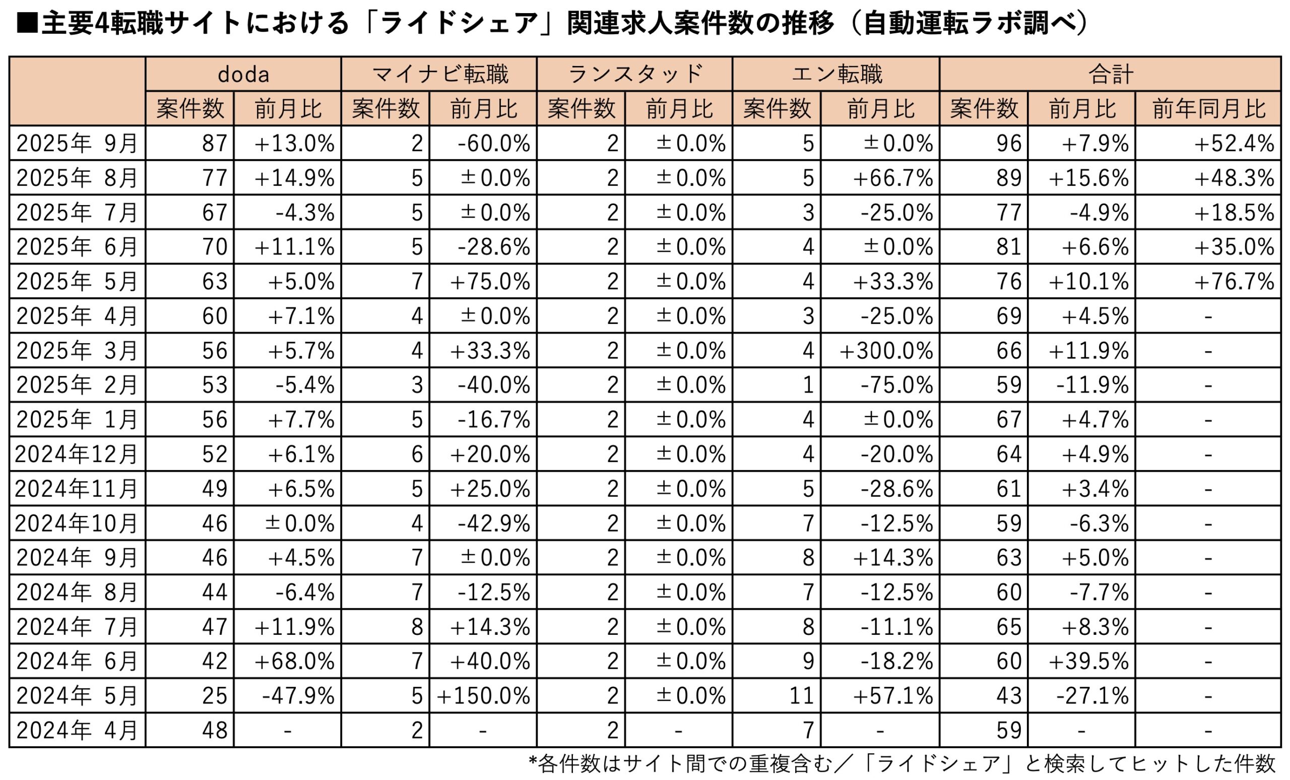 日本唯一の自動運転専門ニュースメディアである「自動運転ラボ」(運営:株式会社ストロボ)は、主要4転職サイトにおける2025年9月末時点の「ライドシェア」関連求人案件数を発表した。