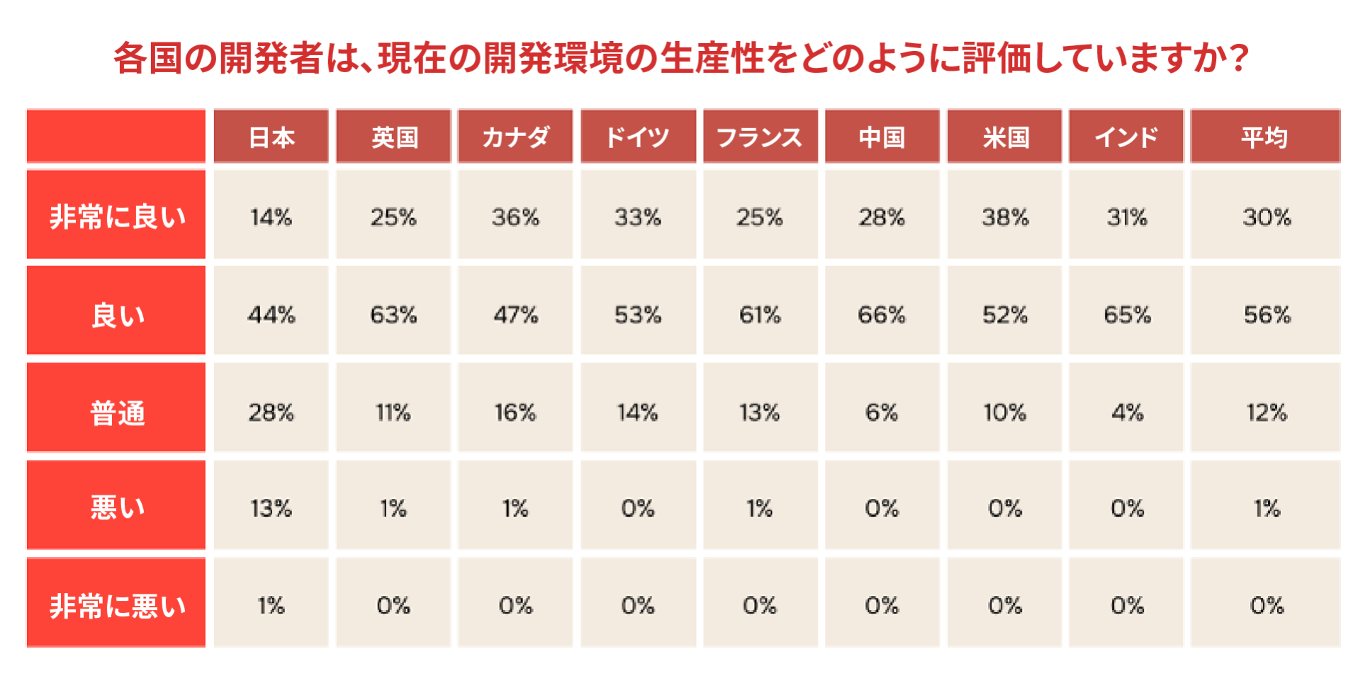 一方、「普通」(28%)、「悪い」(13%)、「非常に悪い」(1%)と答えた割合は、いずれも調査対象国のうち最も高く、開発環境への評価がグローバルに比べ総じて低い傾向が浮かび上がったという。
