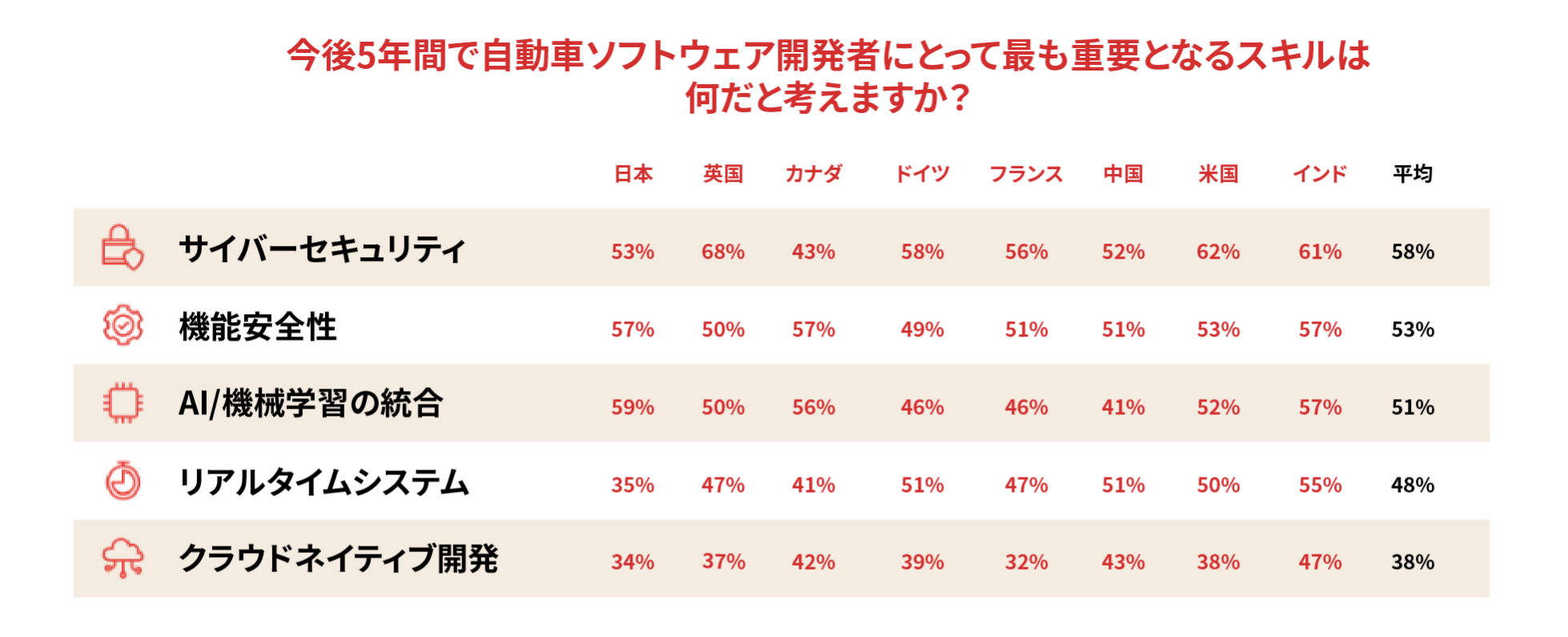 「今後5年間で自動車ソフトウェア開発者にとって最も重要となるスキルは何か」という問いに対し、日本は「サイバーセキュリティ」53%(グローバル平均58%)、「機能安全性」57%(同53%)、「AI/機械学習の統合」59%(同51%)、「リアルタイムシステム」35%(同48%)、「クラウドネイティブ開発」34%(同38%)という結果となった。