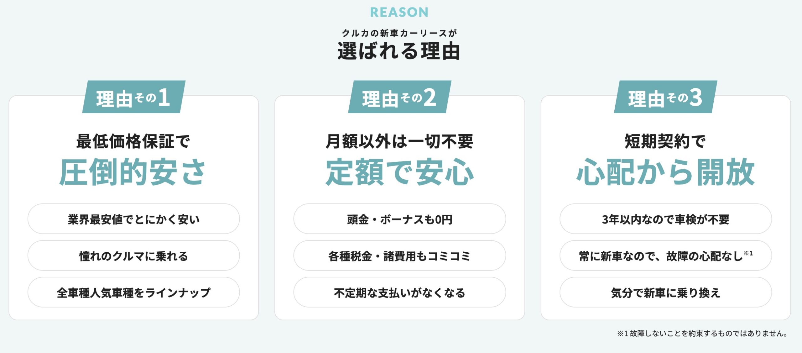 クルカは、3年契約のカーリースとなっており、人気車種が取り揃えられている。契約満了後は、他社にリース車を売ることとなっており、走行距離の制限を設けることで安い利用料金を実現した。口コミや評判でも、料金が安いという声が多く、WEBで契約完了して手軽だという声もあった。