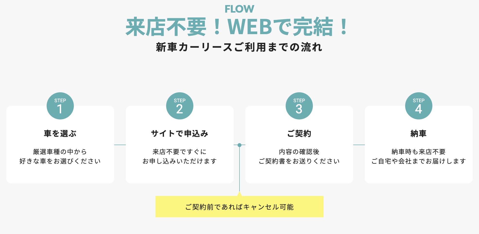 申し込みから契約まですべてWEBで完結する。LINEで行うことも可能だ。場合によっては電話連絡もくるが、申込みから契約までの殆どの手順をWEBで行える。WEB完結であるため、店舗へ出向く必要がなく、忙しい中でもリース契約して車を使える。