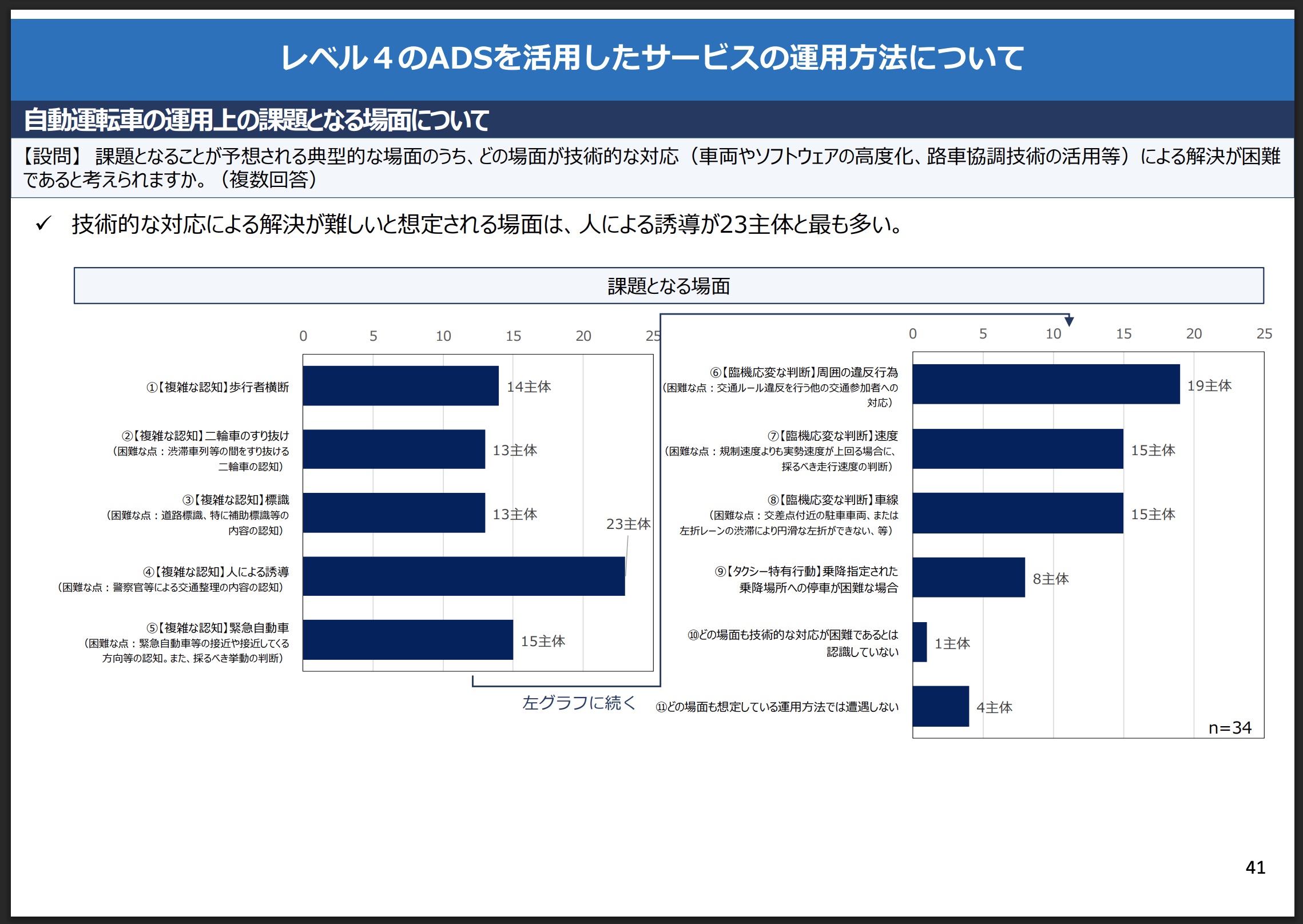 警察庁所管の自動運転の拡大に向けた 調査検討委員会が国内外の自動車メーカーや実証主体などを対象に2024年に実施したヒアリング調査では、回答があった35主体のうち、技術的な対応(車両やソフトウェアの高度化、路車協調技術の活用など)による解決が困難な場面として23主体が「人による誘導」を挙げた。