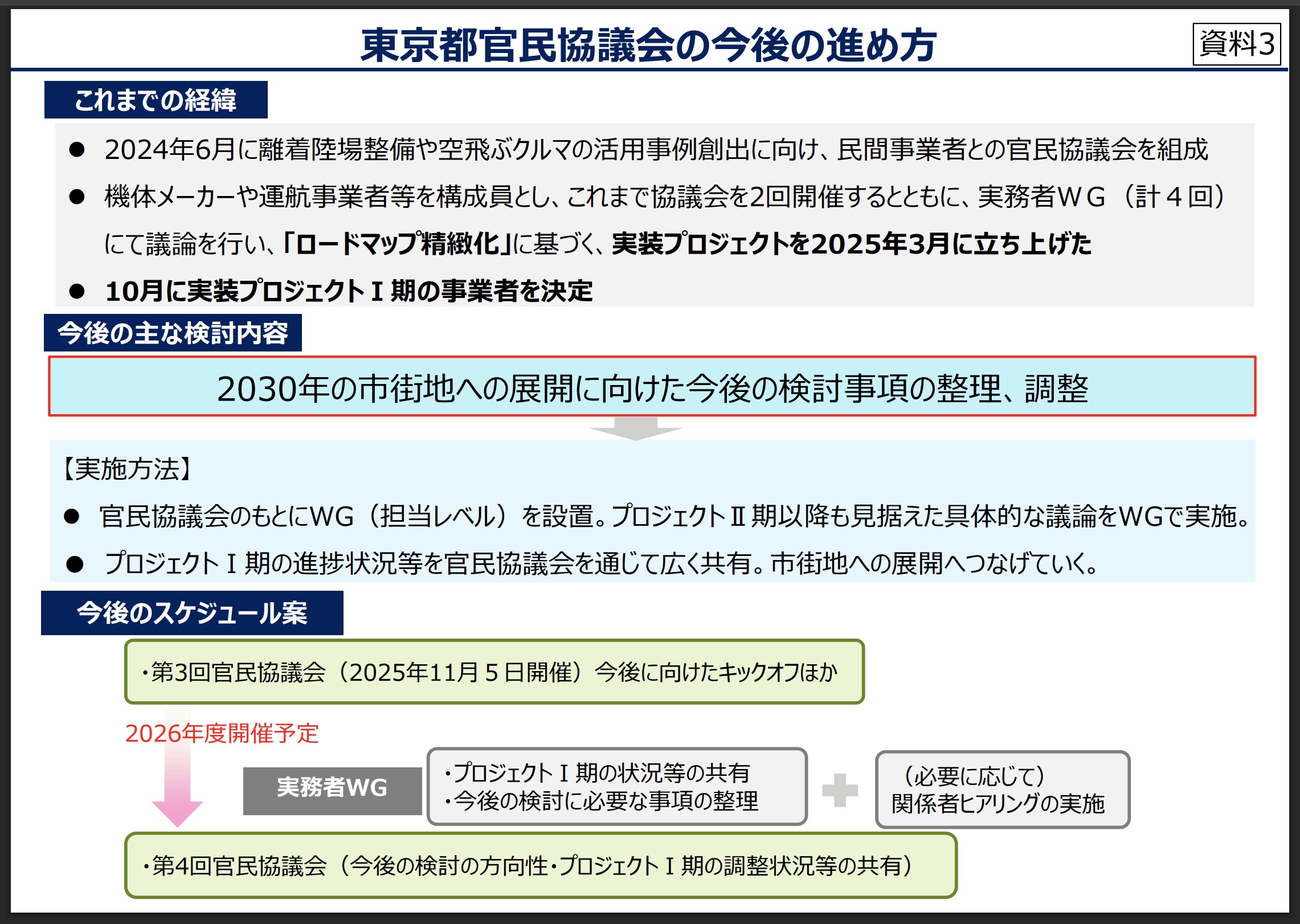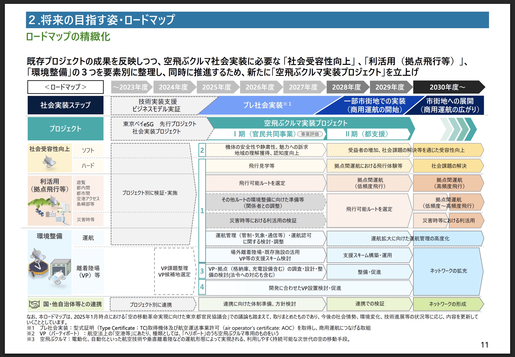 これを踏まえ、ロードマップの精緻化と商用運航に向けた実装プロジェクトの構築を進め、2025年3月に「東京都 空飛ぶクルマ実装プロジェクト Version1」を発表した。