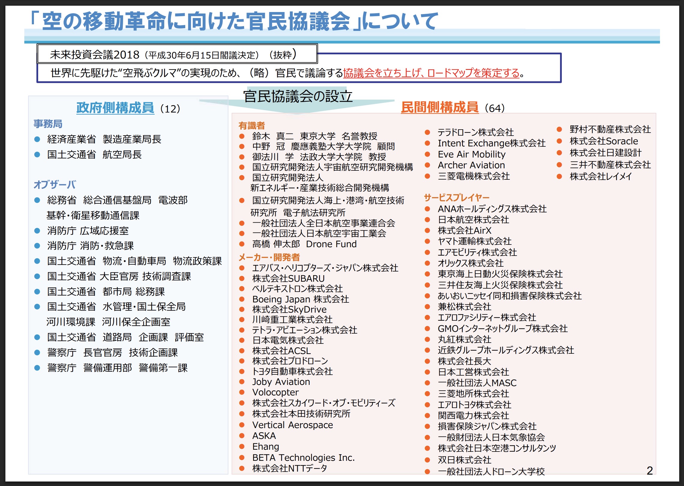 構成員には、ANAホールディングスや日本交通、朝日航洋、Joby Aviation、丸紅、SkyDrive、兼松、三菱地所、野村不動産、日本電気、NTTコミュニケーションズが名を連ねている。