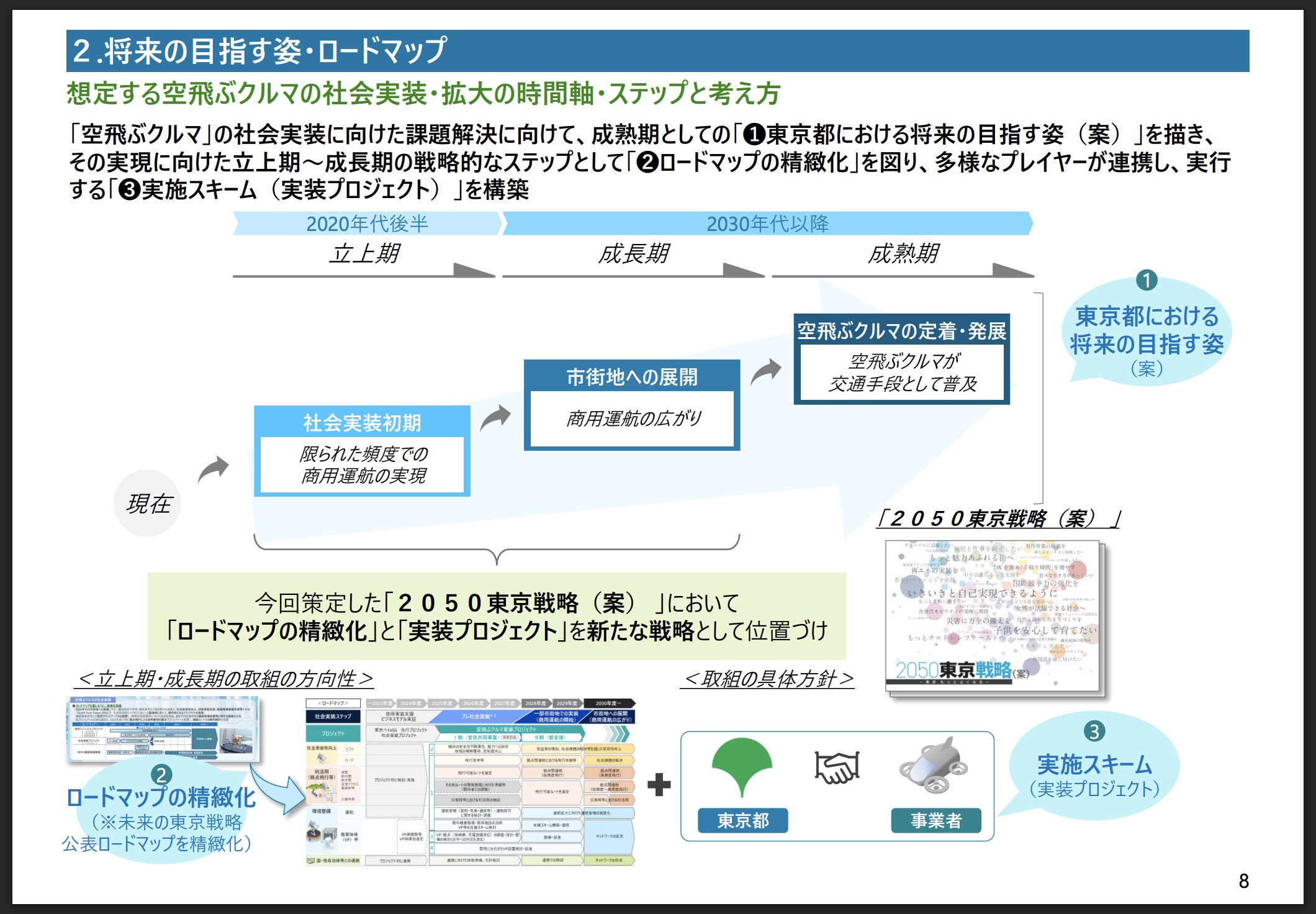 「準備・調整・計画・検討」「実証飛行」「プレ社会実装の推進」期間と位置づけ、東京都との連携のもと臨海部エリア・河川上エリア(空港へのアクセスを想定)での飛行を目指すとしている。