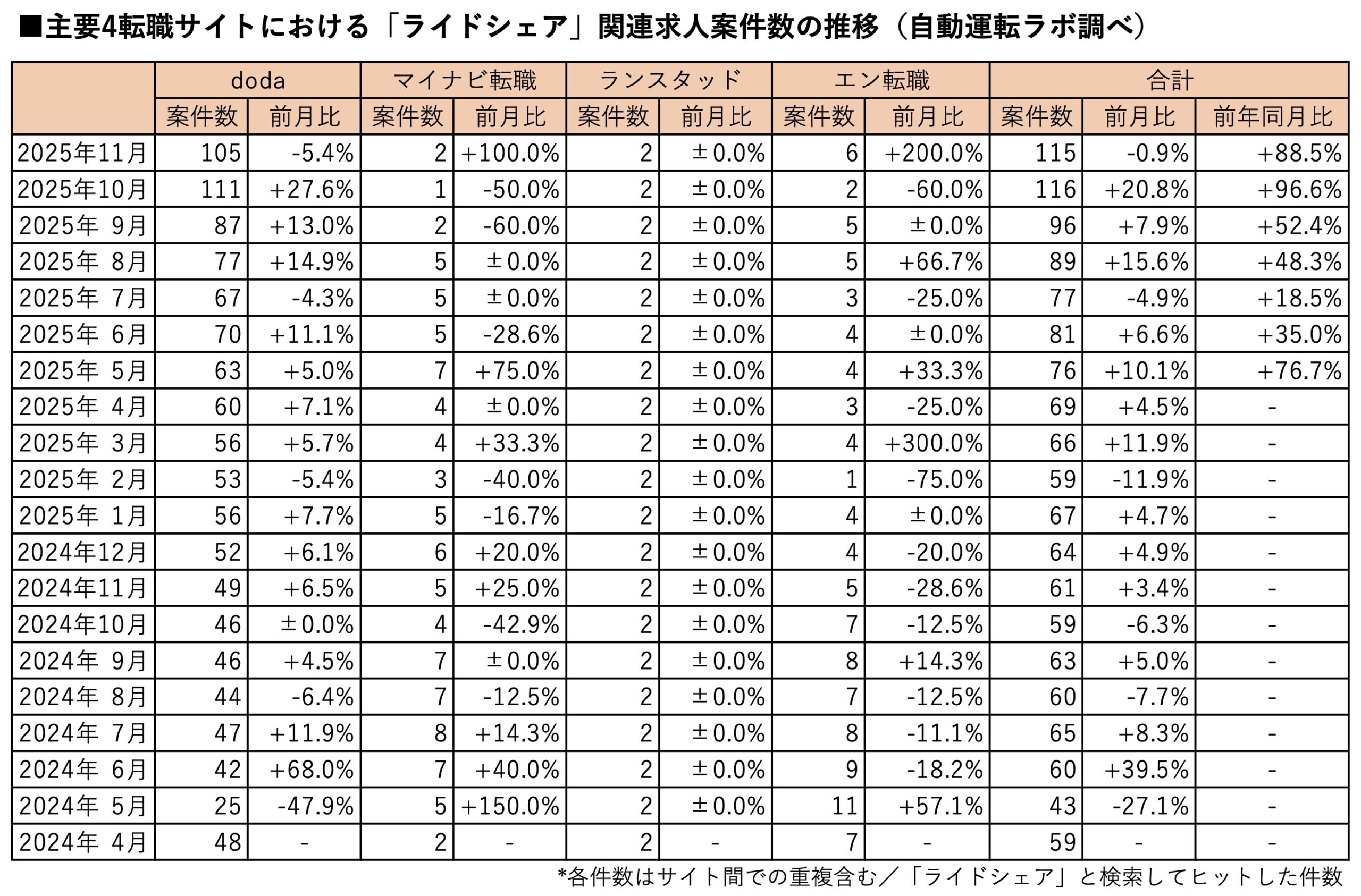 日本唯一の自動運転専門ニュースメディアである「自動運転ラボ」(運営:株式会社ストロボ)は、主要4転職サイトにおける2025年11月末時点の「ライドシェア」関連求人案件数を発表した。