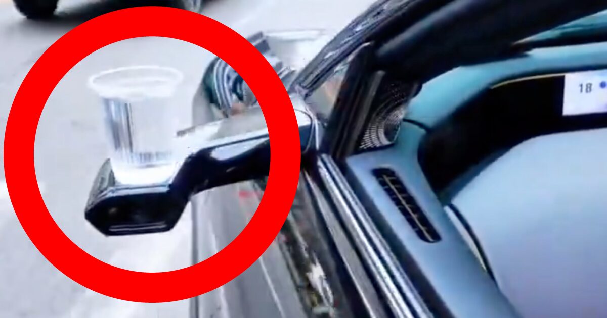 動画では、左ハンドル車の運転席の外やや後方からのアングルで、左のデジタルサイドミラーやハンドルが映し出されている。ミラーの上には水が入ったコップが置かれており、ハンドルは誰も触っていない。運転席のドライバーも見えず、「無人の自動運転?」と思われそうだが、おそらくわざと映らないように座っているものと思われる。