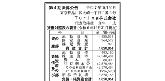 完全自動運転の実現に取り組むスタートアップであるTuring株式会社(本社:東京都大田区/代表取締役:山本一成)の第4期決算公告(2024年12月31日現在)が、官報に掲載されている。第4期の当期純損失は、9億2,659 … 続きを読む 完全自動運転めざすTuring、年間9億円の赤字判明 第4期決算