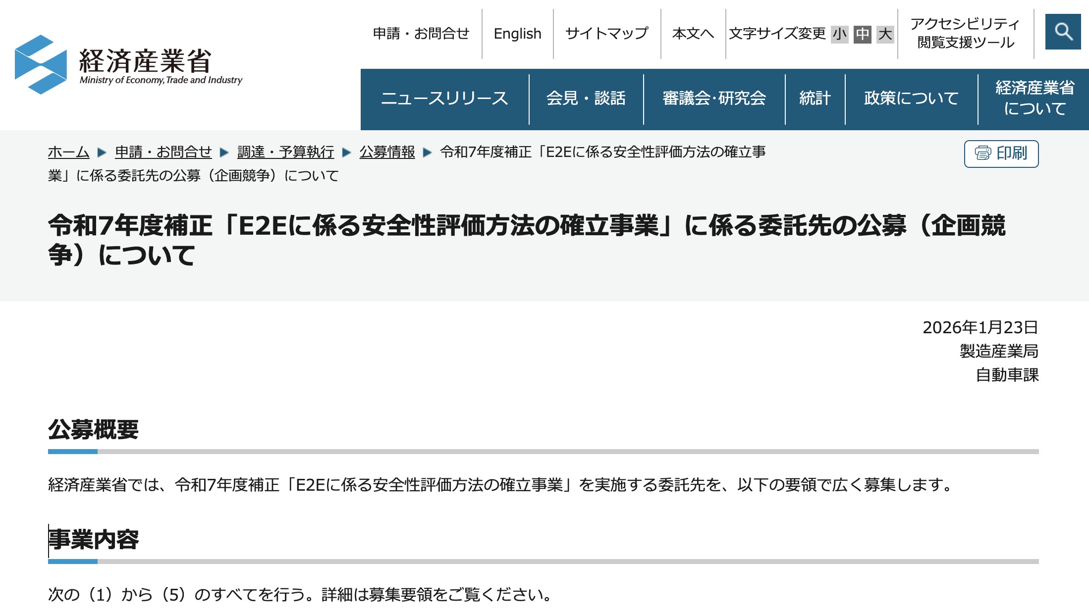 経済産業省が、「E2Eに係る安全性評価方法の確立事業」に係る委託先の公募を開始した。令和7年度補正による予算80億円規模の自動運転事業だ。