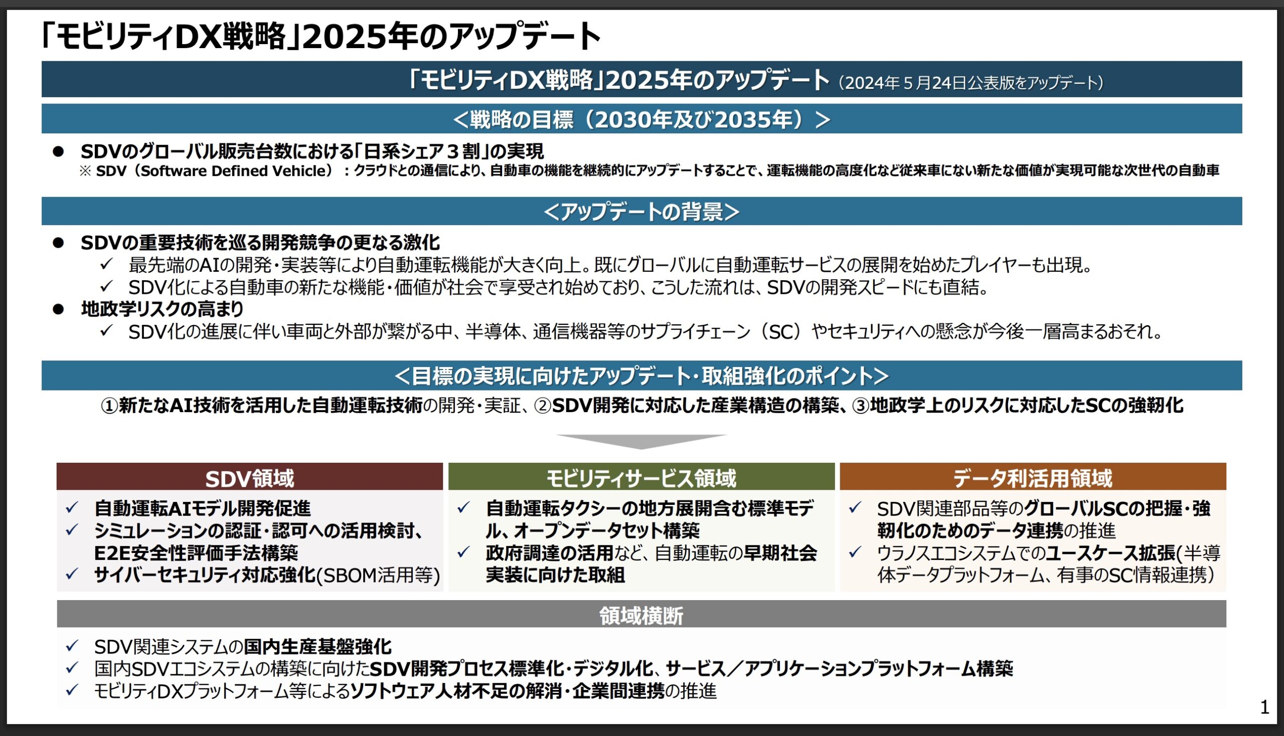 同戦略は、官民での議論から導き出した2030~2035年に向けた勝ち筋として、ソフトウェア・ディファインド・ビークル(SDV)や自動運転、MaaSといった新たなモビリティサービス、企業を超えたデータ利活用など、DX全体を貫く戦略として2024年5月に策定された。