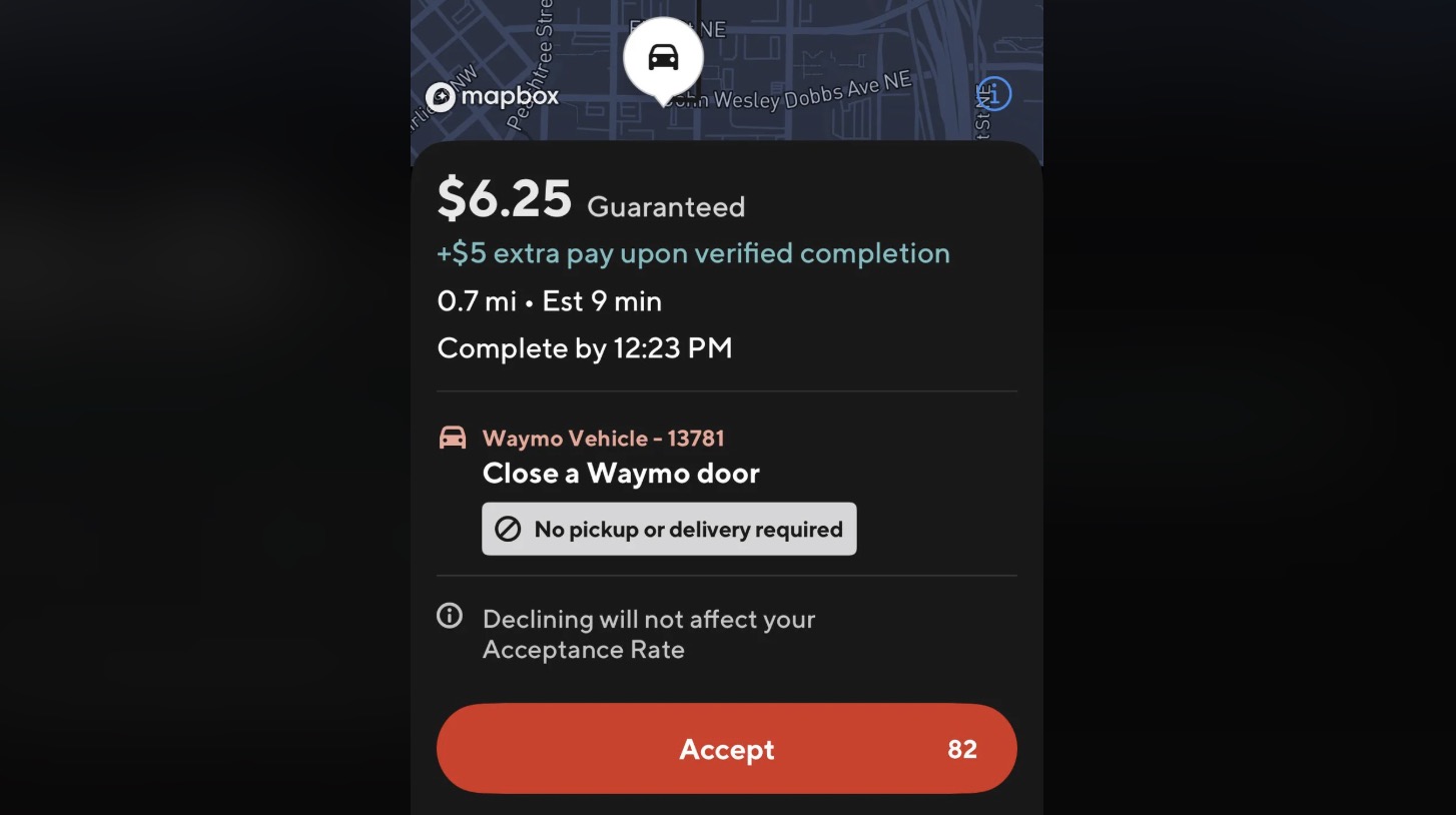 Waymoによるドア閉めの仕事は、フードデリバリープラットフォーマーのDoorDashユーザーが「Craziest Offer(最もクレイジーなオファー)」としてSNSに投稿したことで判明した。