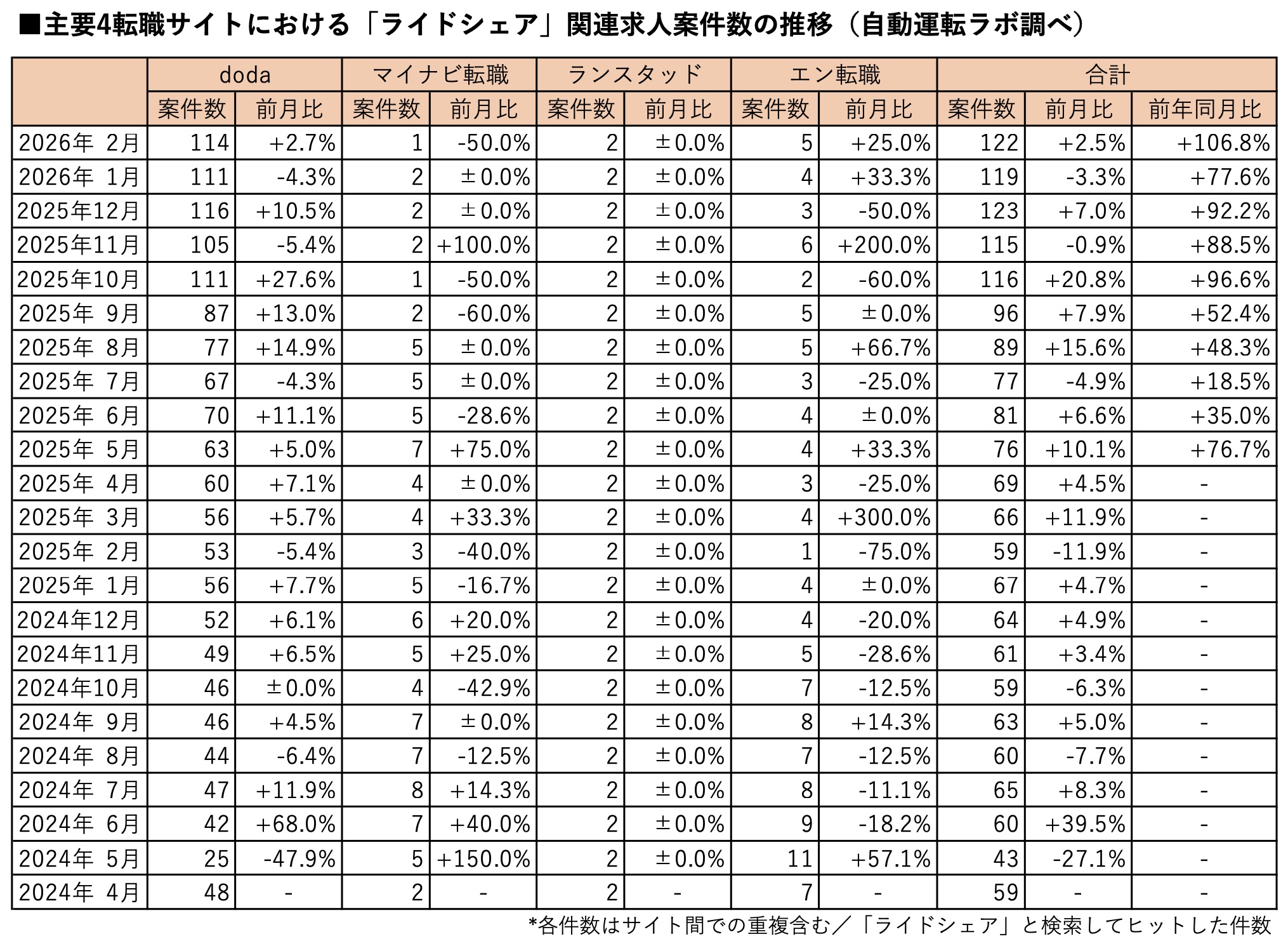 日本唯一の自動運転専門ニュースメディアである「自動運転ラボ」(運営:株式会社ストロボ)は、主要4転職サイトにおける2026年2月末時点の「ライドシェア」関連求人案件数を発表した。