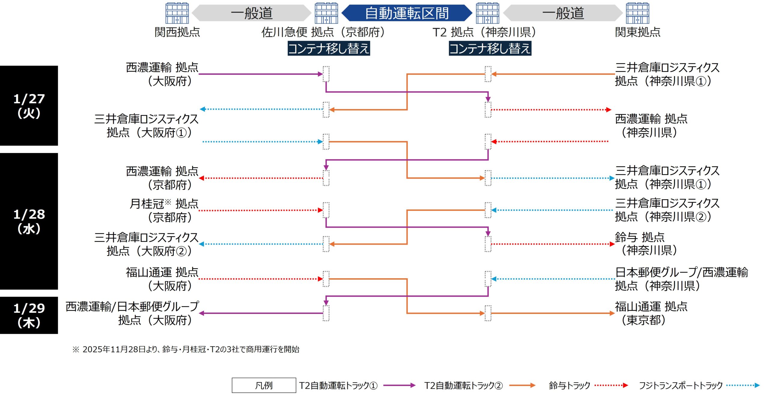 高速道路における無人運転と一般道における有人運転を切り替えるため、神奈川県厚木市と京都府八幡市にある物流施設を切替拠点に見立てた上で、高速道路はT2のレベル2トラック、一般道は鈴与とフジトランスポートのトラックで運行した。