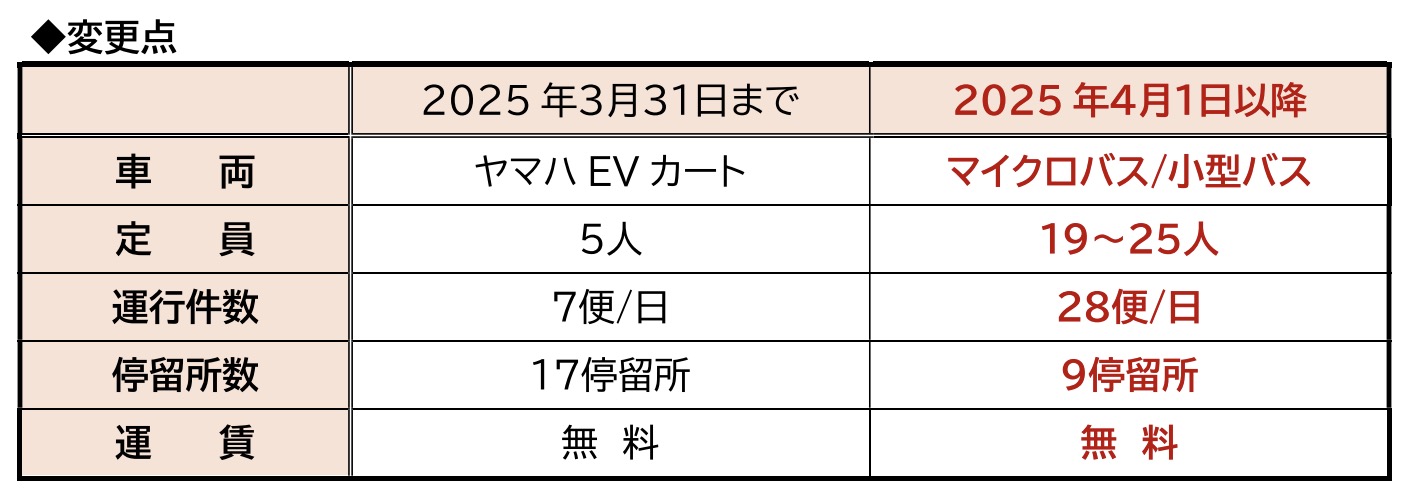 同じモデルの車両を使用している沖縄県北谷町の取り組み(美浜シャトルカート)を調べてみたところ、2025年度にヤマハ発動機製EVバスからマイクロバス・小型バスに切り替えられており、同エリアの無料周遊バスサービスは2025年度末で終了するようだ。