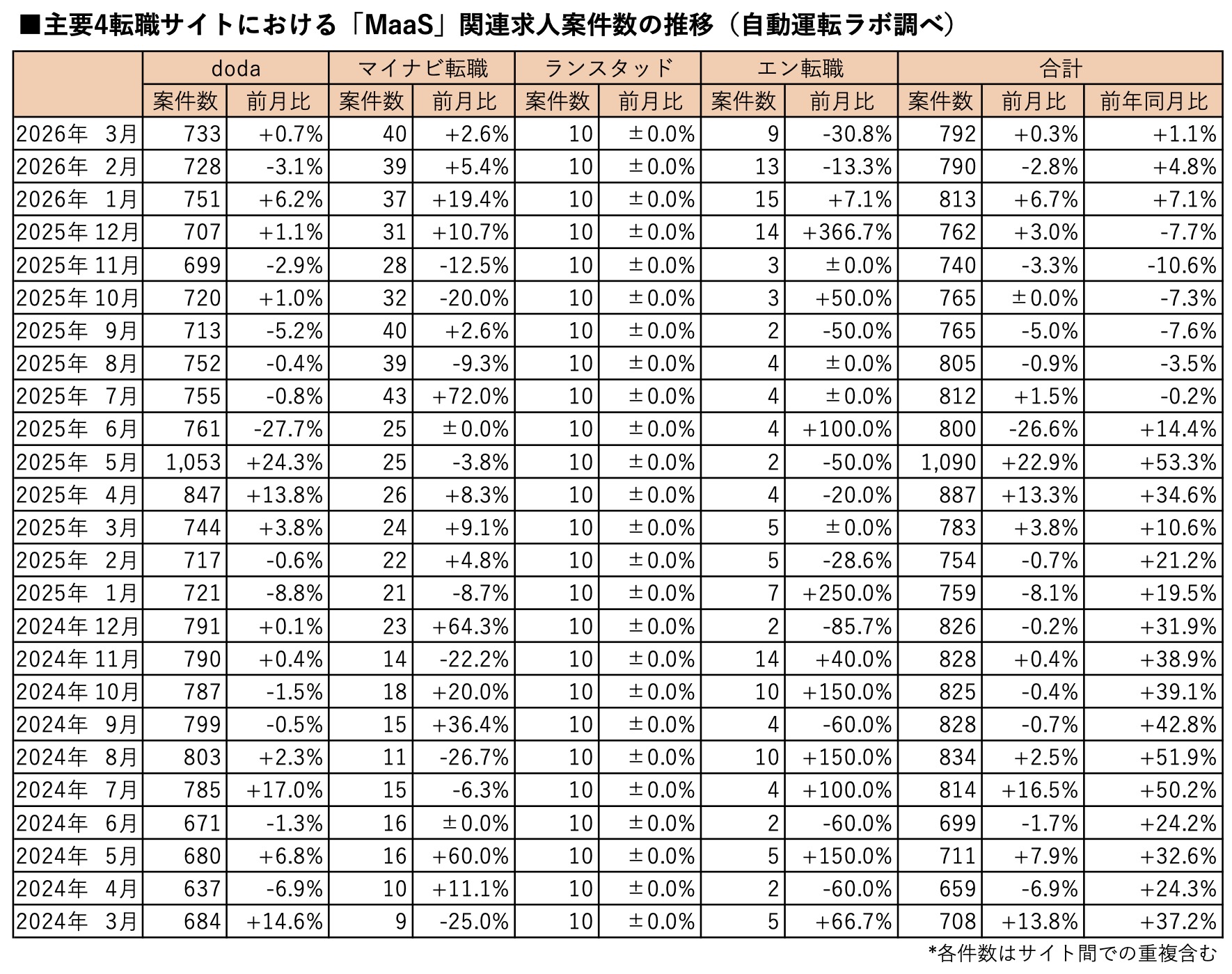 日本唯一の自動運転専門ニュースメディアである「自動運転ラボ」(運営:株式会社ストロボ)は、主要4転職サイトにおける2026年3月末時点の「自動運転」関連求人案件数と「MaaS」関連求人案件数をそれぞれまとめた。