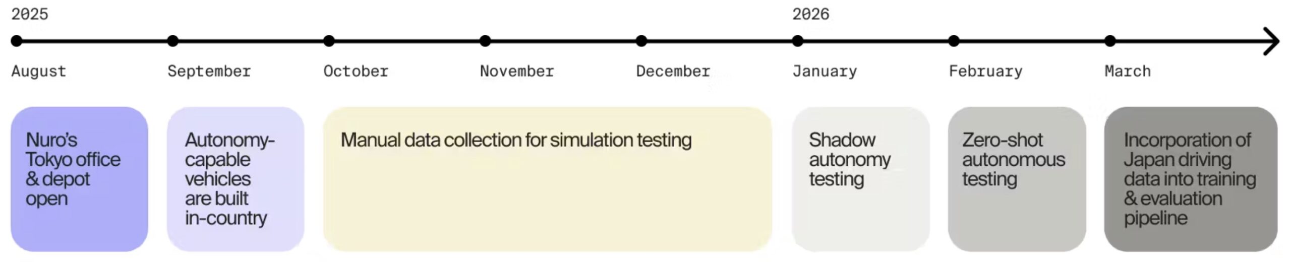 2025年12月には、東京都内の平和島を中心に自動運転技術の実用化を目指す平和島自動運転協議会に参画したことが発表された。Nuroは、同協議会のビジョンと連携し、日本における社会受容性を高めより安全で持続可能なモビリティ環境の発展に貢献するとコメントしている。