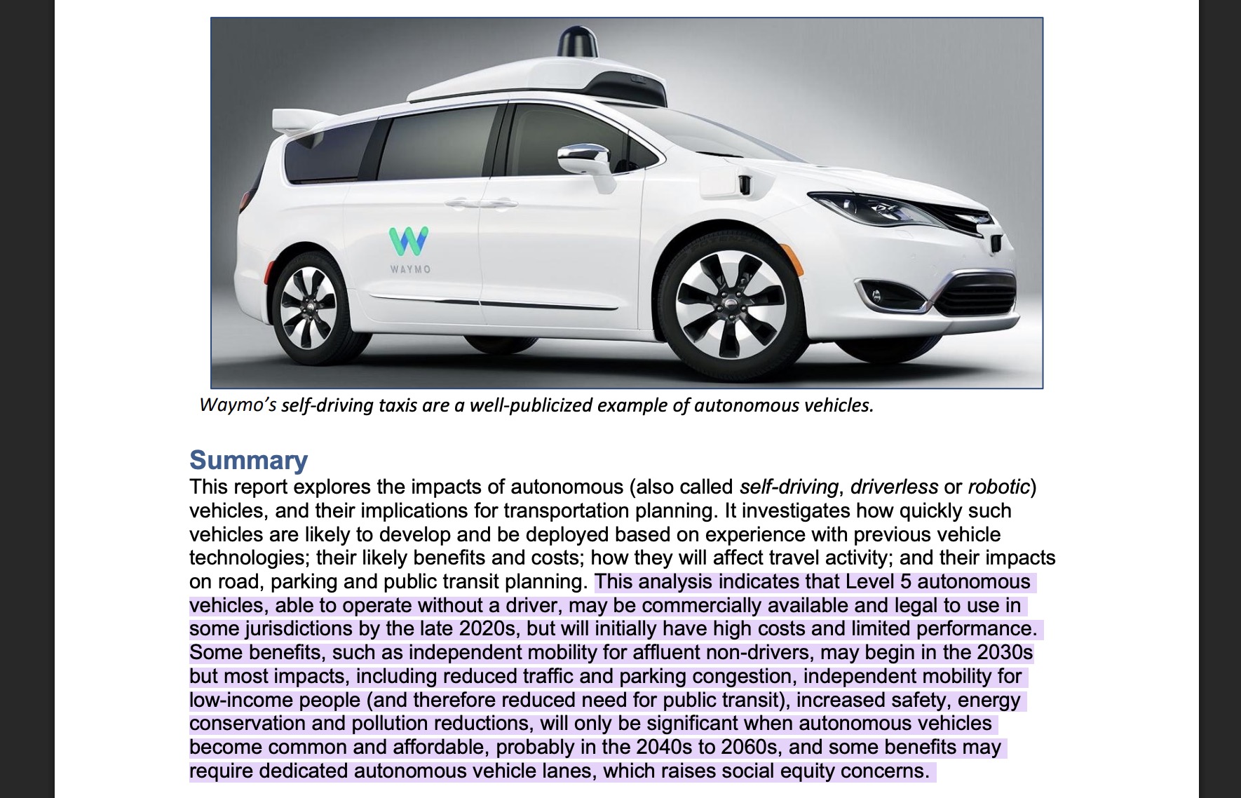 カナダのビクトリア州交通政策研究所は、レベル5の自動運転車は2020年代後半までに一部地域で市販され、合法的に利用できるようになる可能性があるものの、当初は高コストで性能も限定的となる見込みとしている。
