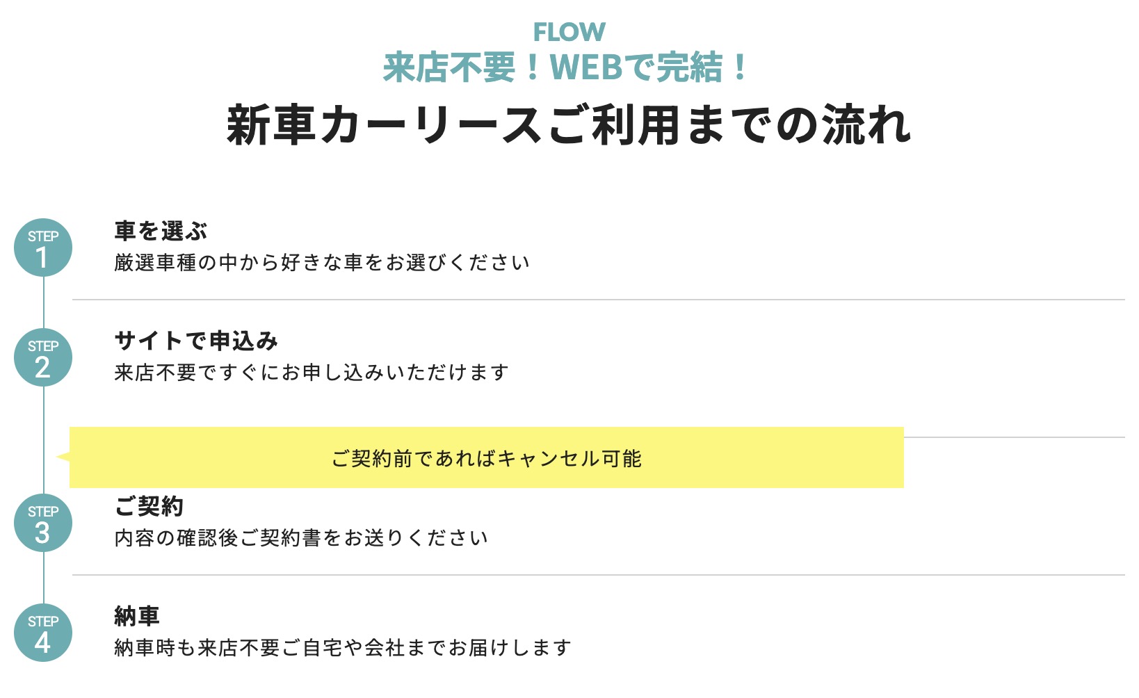 契約期間は3年であり、短期契約者向けのカーリースである。短期契約にして車の残価を高めにして、その分毎月の定額費用を抑えている。