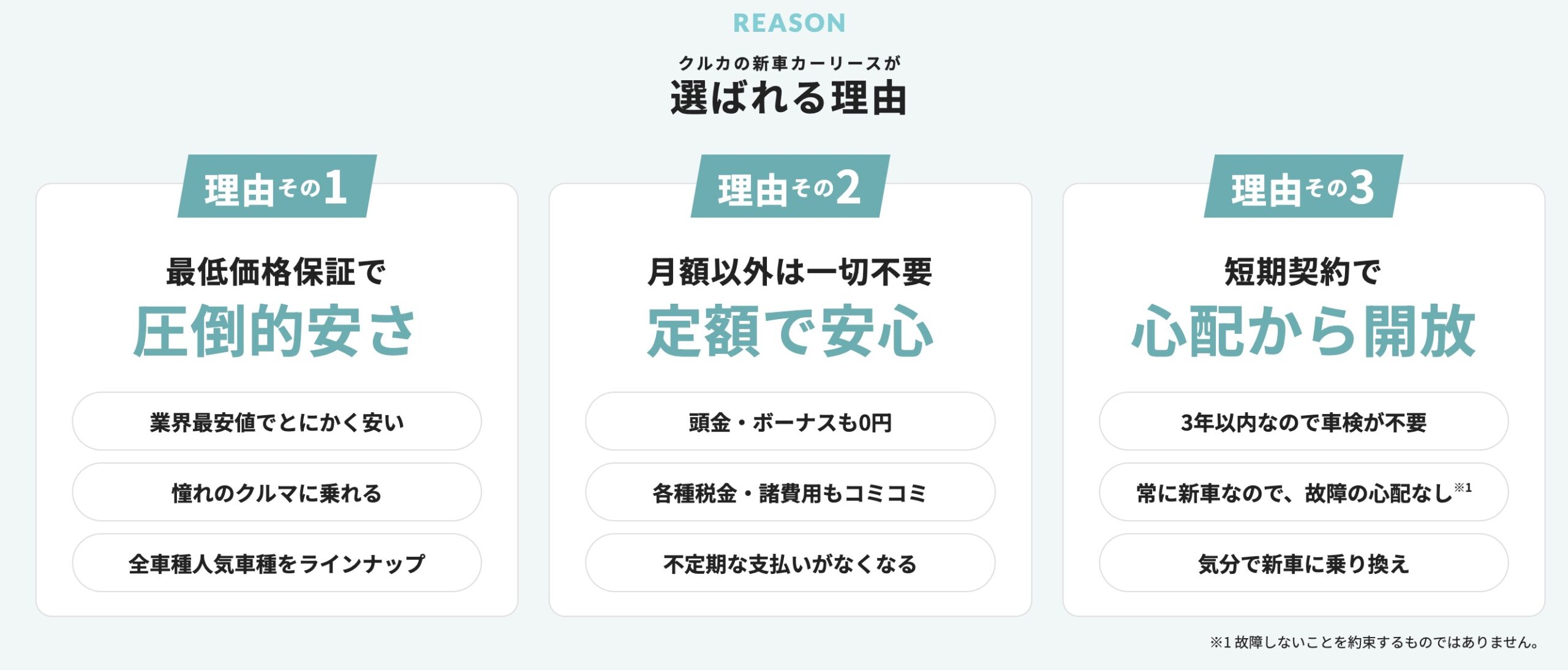 月額料金のみであり、3年でいくら支払えばいいか契約で確認できるので、契約金額や支払総額がわかりやすいという評判もある。また、クルカは最低価格保証を謳っており、他車よりも安いリース料金に設定されている。