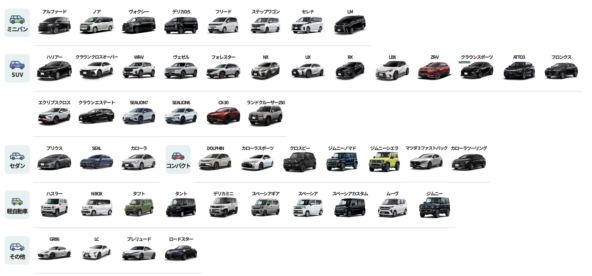 軽自動車からセダン、ミニバンといくつもの車種が用意されているので、どの車に乗りたいかクルカのサイトを見てみよう。