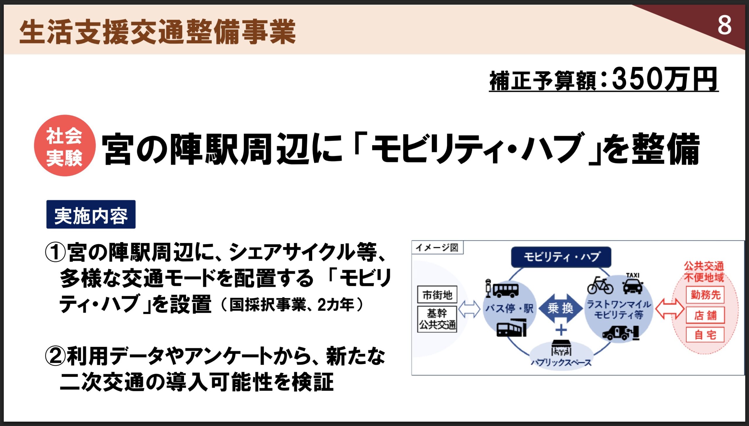 久留米市は、生活支援交通整備事業として補正予算350万円を計上し、宮の陣駅周辺に 「モビリティハブ」を整備する社会実験を行っている。2カ年事業で、シェアサイクルなど多様な交通モードを配置し、新たな二次交通の導入可能性を検証する。