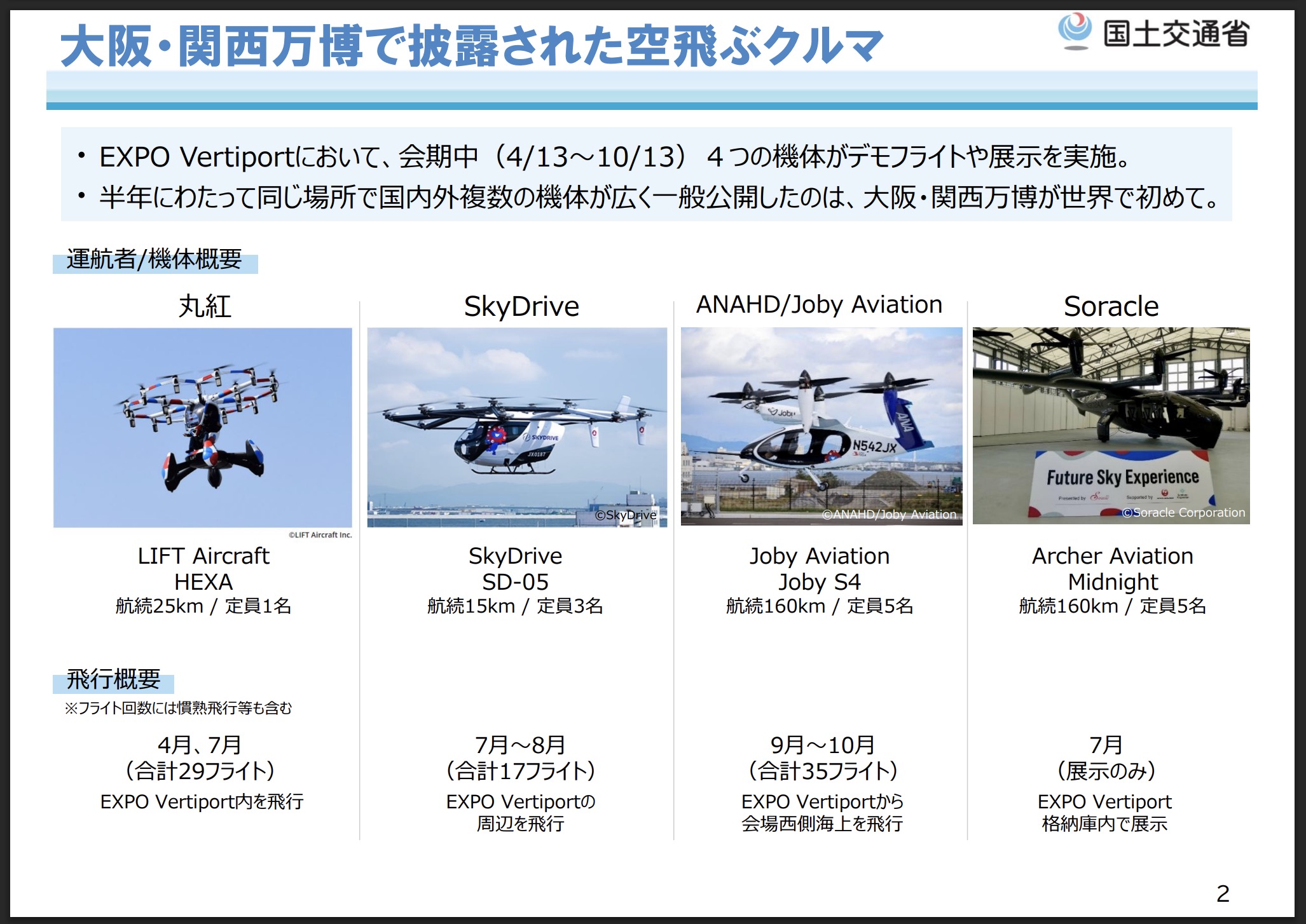ANAホールディングス×Joby Aviation、日本航空(Soracle)×Archer Aviation、丸紅×Vertical Aerospace×LIFT AIRCRAFT、SkyDrive――の4陣営が参画することとなり、開催期間中、会場内外でヒトの輸送などを行う計画を公表していた。国内初の商用化事業だ。