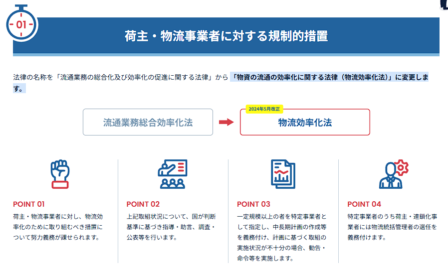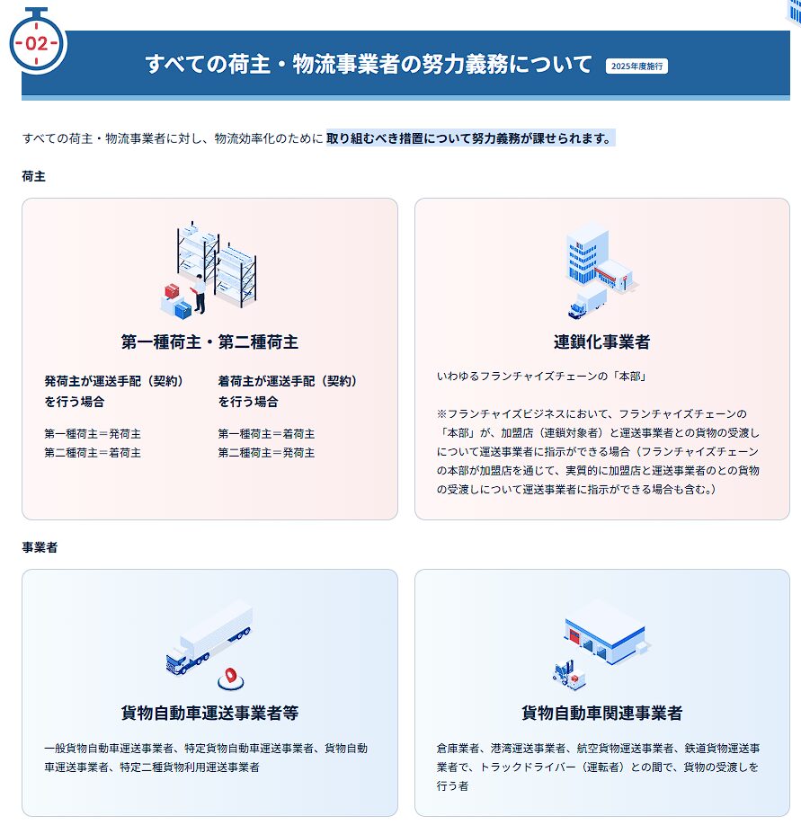 法の施行は段階的に行われた。2025年4月に全ての荷主・物流事業者に対し、積載効率の向上、荷待ち時間の短縮、荷役等時間の短縮の3点が努力義務として課された。