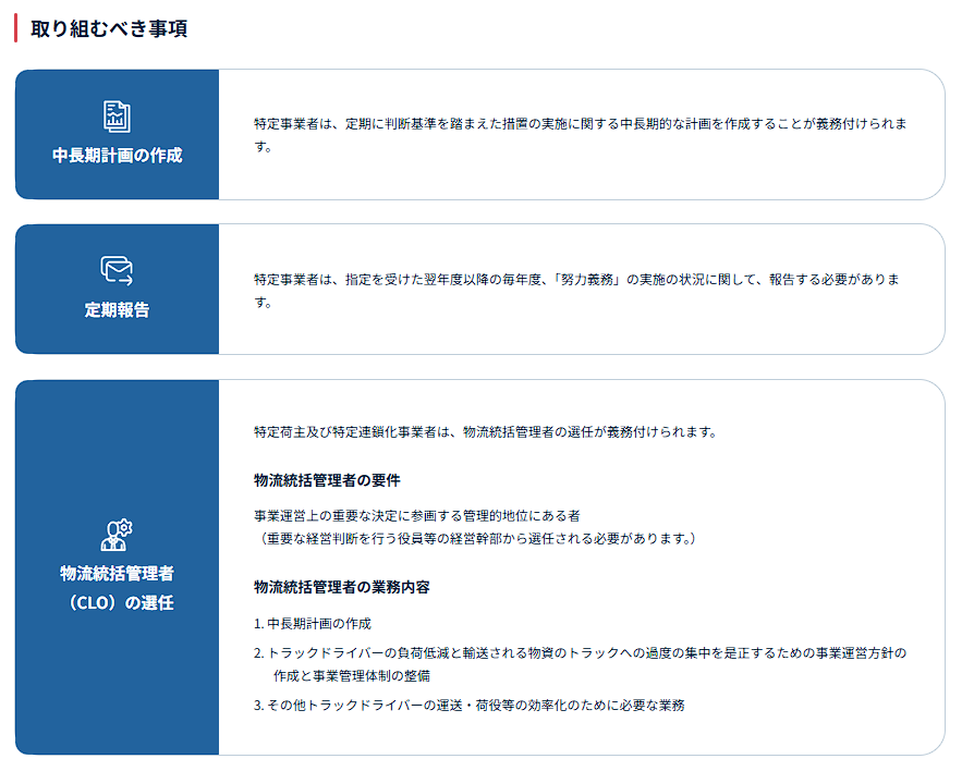 2026年4月以降に特定荷主として指定された企業には、次の3つが義務付けられる。