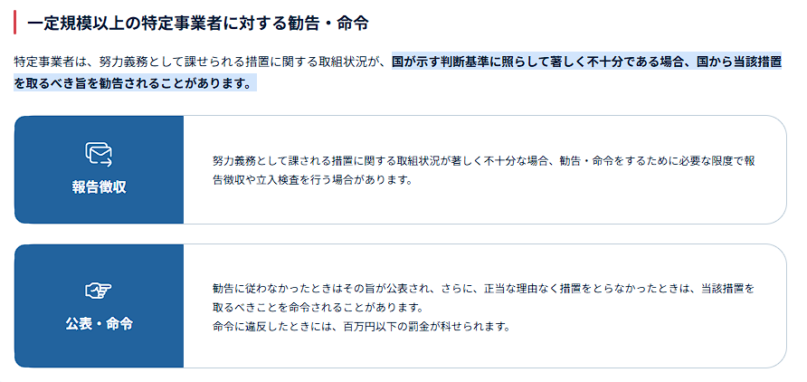計画に基づいた取り組みが不十分と判断された場合、国は助言・指導→勧告→企業名の公表→命令という段階的な行政処分を発動できる。金銭的な罰金よりも「企業名の公表」が実質的には最大のペナルティとなる。ESG投資家や取引先からの信頼失墜、採用ブランドへの悪影響など、企業の評判に直結するリスクだ。